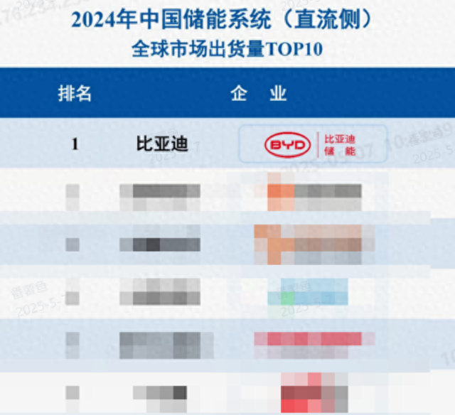 根据高工产研(GGII)发布的《2024年中国储能系统(直流侧)全球市场出货量TOP10》榜单,比亚迪储能继续蝉联榜首。