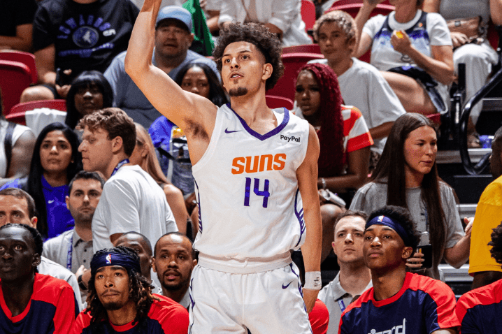 7月12日NBA夏季联赛中,太阳以103-84战胜奇才,这场比赛里41号秀布雷亚表现极为出色,力压多位首轮秀,成为赛场上的焦点。布雷亚作为NCAA顶级投手,本就具备不俗的实力,在这场比赛中更是将自己的优势展现得淋漓尽致。